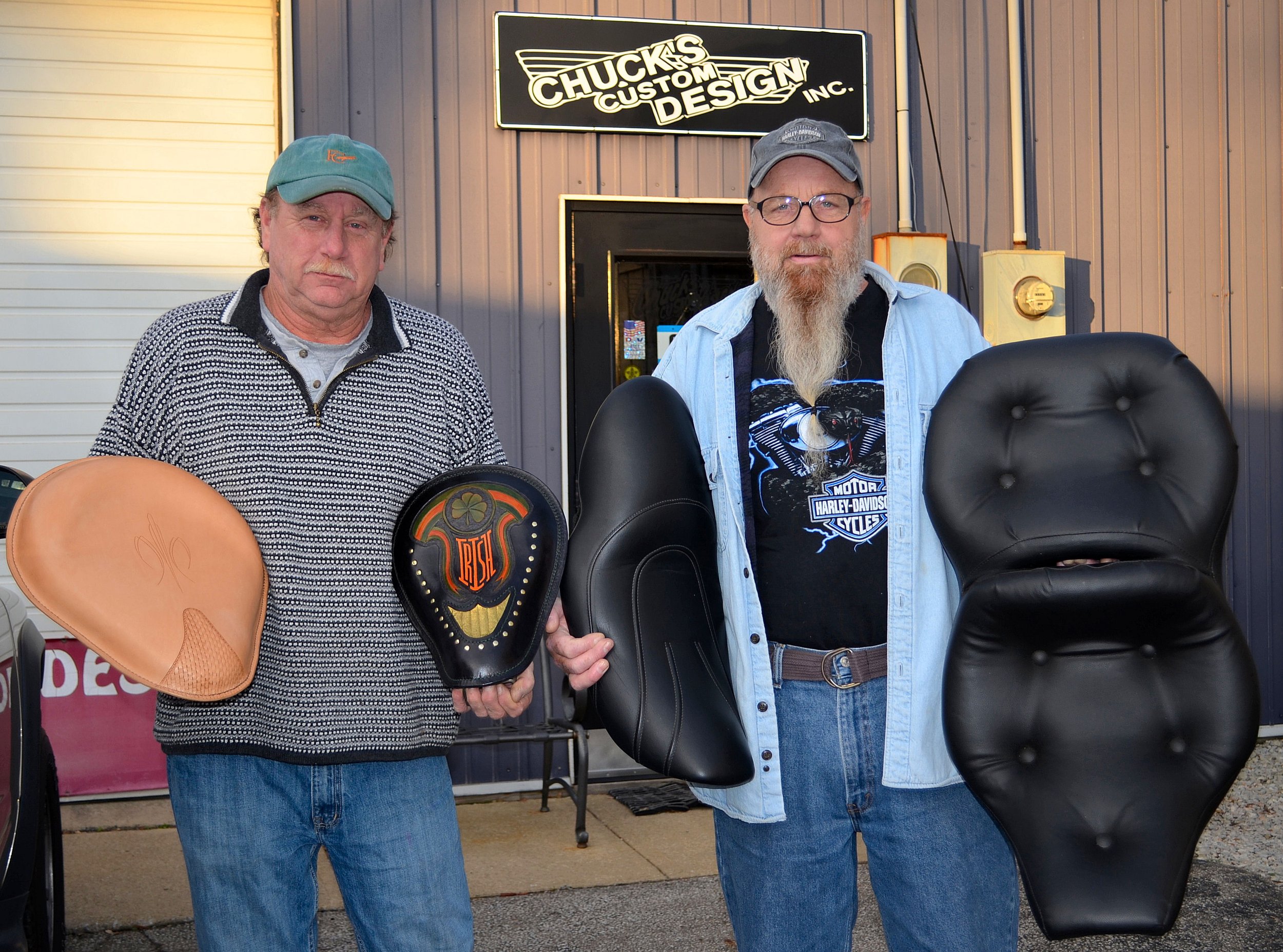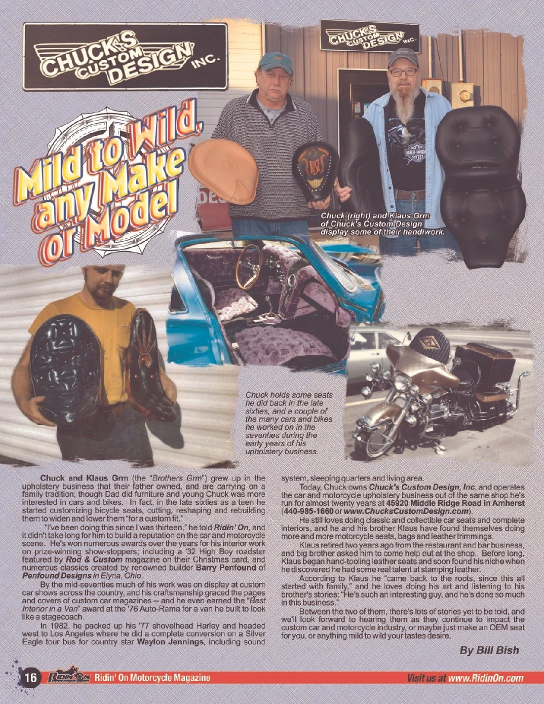 Chuck and Klaus Grm (the “Brothers Grm”) grew up in the upholstery business that their father owned, and are carrying on a family tradition; though Dad did furniture and young Chuck was more interested in cars and bikes. In fact, in the late sixties as a teen he started customizing bicycle seats, cutting, reshaping and rebuilding them to widen and lower them “for a custom fit.”